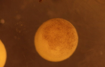 Hier sieht man ein Froschei in einem späten Furchungsstadium der Blastula. Die Balstoporusbildung hat noch nicht eingesetzt.