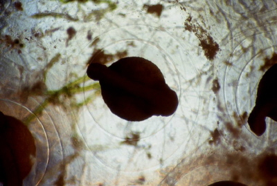 Der Embryo ist noch von seiner Eihülle mit Gallerte umschlossen. Deutlich ist der Schwanz zu erkennen, ebenso die Kopfknospe.