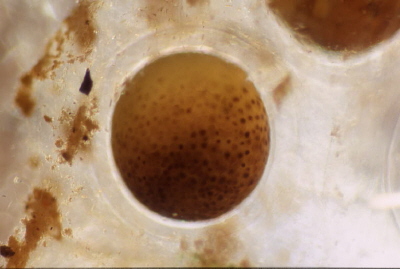 Zu sehen ist die Blastula eines Frosches.Deutlich sind die Einzelzellen zu erkennen, dazu die umgebende Eihülle und Gallerte.