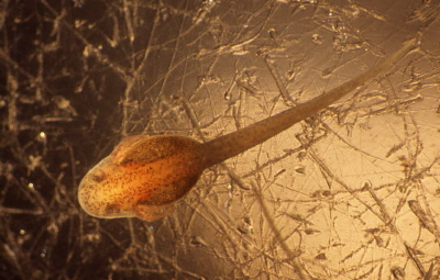 Zu sehen ist eine freischwimmende Kaulquappe mit Aussenkiemen. Deutlich sind die außenliegenden Kiemenäste zu