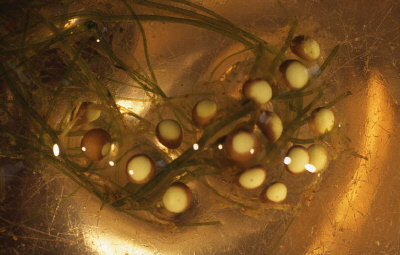 Mehrere Embryonen im Stadium der frühen Gastrulation. Deutlich ist der Balsoporus and der anderen Färbung zu erkennen.